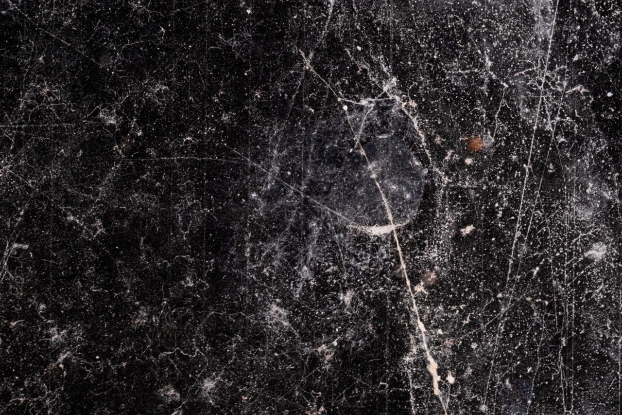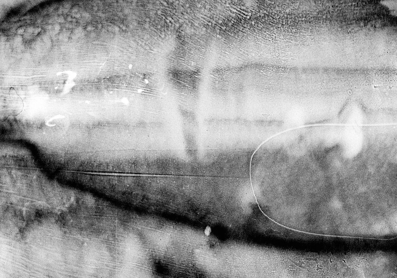 Black and white image of a hand print with bubble-like patterns on a clear surface.